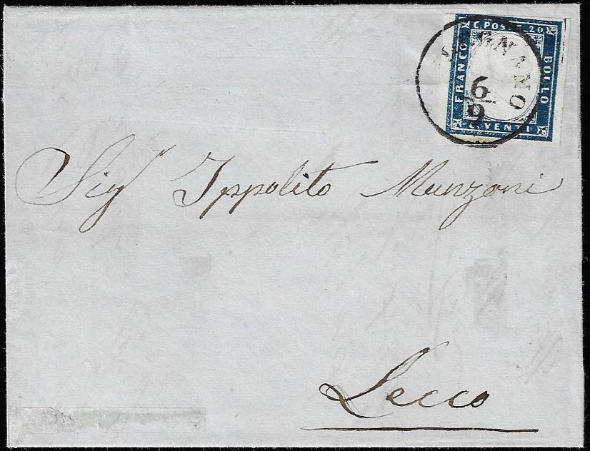 MELEGNANO, C1 punti 13 - 20 cent. (15B), lieve piega orizzontale stirata, su lettera del 6/9/1859 per Lecco. Rara! Cert. Diena.