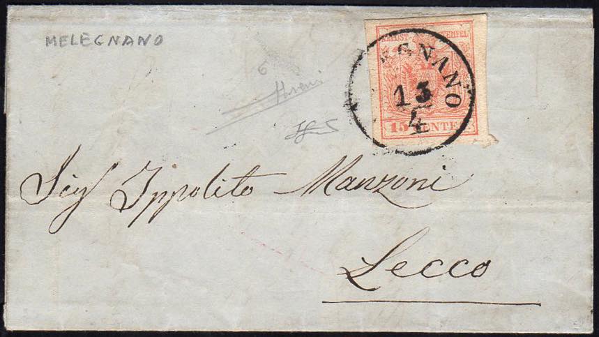 MELEGNANO, C1 punti 7 - 15 cent. (6), perfetto, su sovracoperta di lettera del 13/4/1858 per Lecco. Sorani, Ferrario.