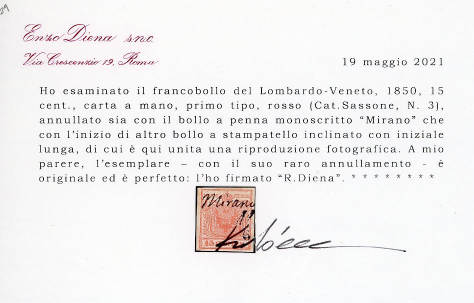 MIRANO, a penna punti 13 + SI Ig - 15 cent. (3), perfetto, annullato con la combinazione di annulli, ad oggi non catalogato. Inedito. Cert. Diena.