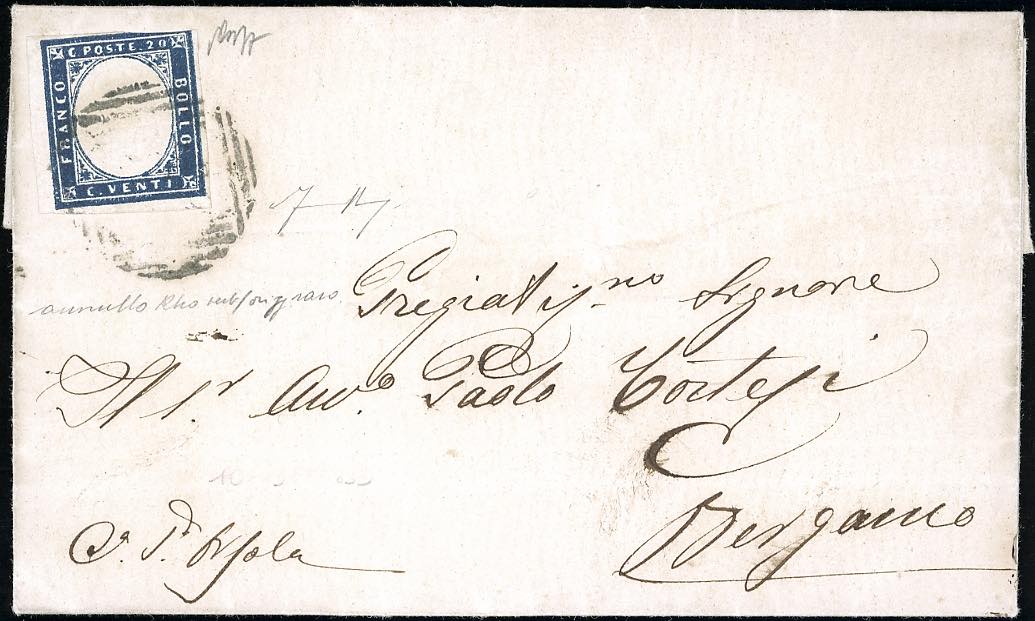RHO, LOV. punti R1 - 20 cent. (Sardegna 15Ba), intaccato in alto, su lettera scritta a Milano ma messa in posta a Rho, annullo come sempre poco leggibile, per Bergamo. Rara. A.Bolaffi, cert. Caffaz.