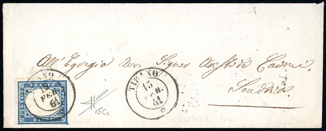TIRANO, sardo italiano punti 13 - 20 cent. azzurro grigio, IV emissione di Sardegna (15Cc), perfetto, usato su fresca busta del 15/2/1861 per Sondrio. Bella e rara. Cert. Sorani.