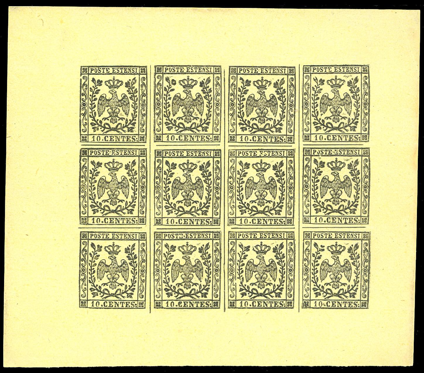 1852 - 10 cent. giallo, carta lucida colorata solo al recto, foglietto completo di 12 prove (P18), senza gomma come sempre, perfetto e di ottima qualità. Raro. A.Diena, Vaccari, cert. E.Diena.