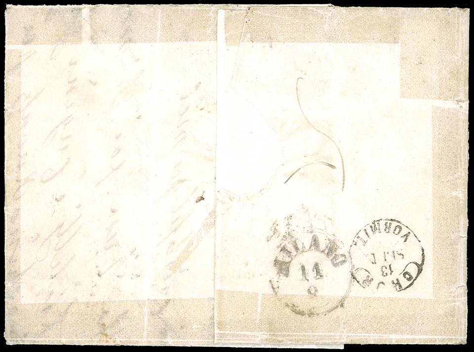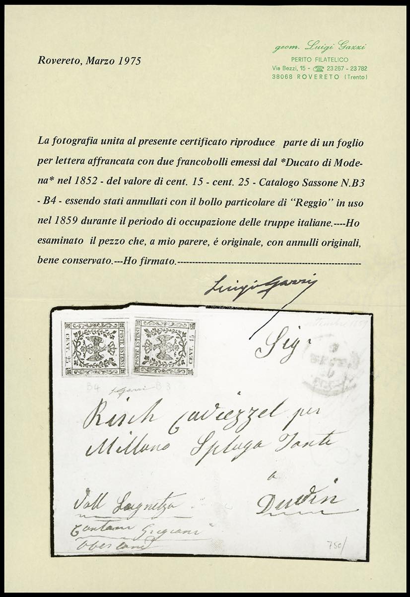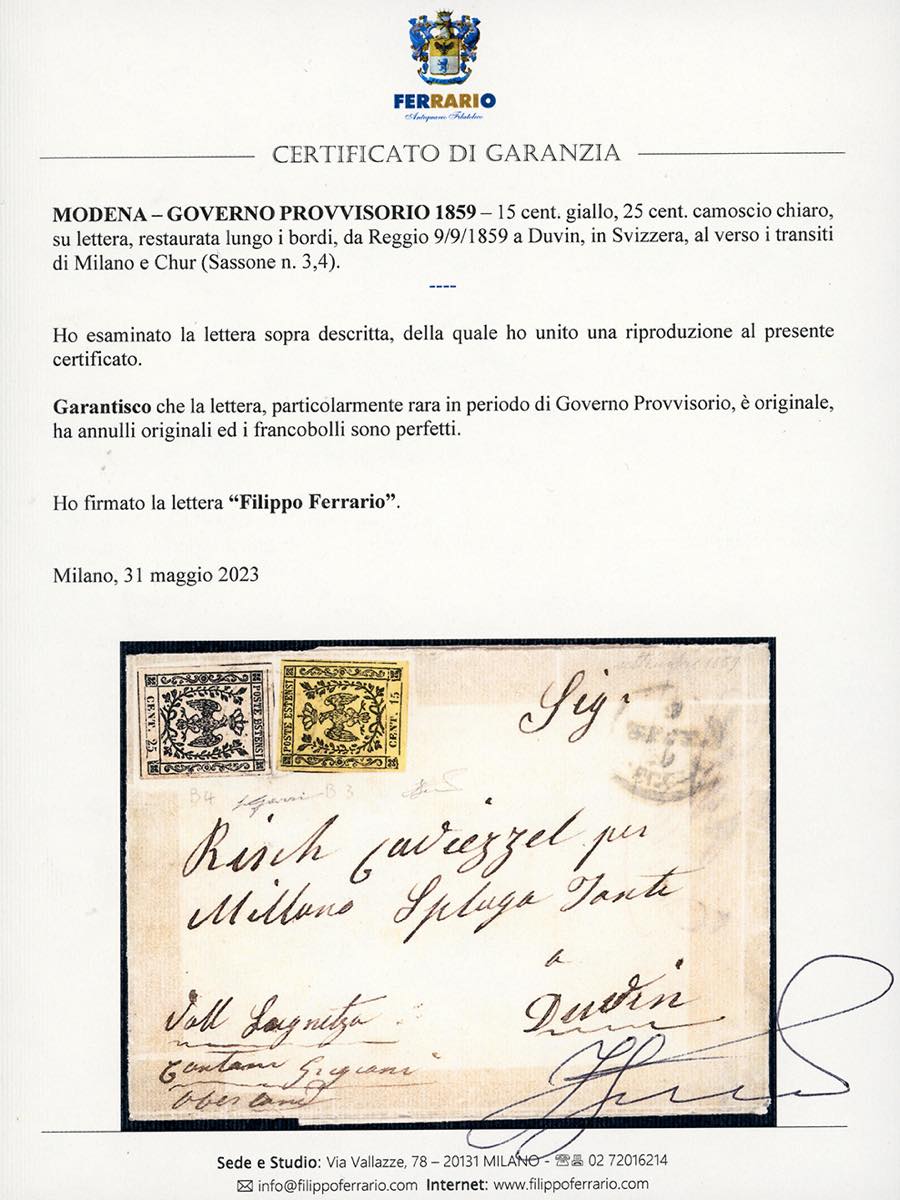 1859 - 15 cent. giallo, 25 cent. camoscio chiaro (3/4), perfetti, su lettera, restaurata lungo i bordi, da Reggio 9/9/1859 a Duvin in Svizzera, al verso i transiti di Milano e Chur. Destinazione molto rara in periodo di Governo Provvisorio. Cert. Gazzi e Ferrario.