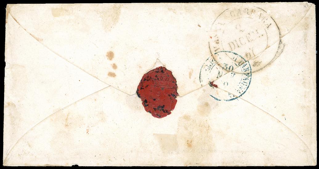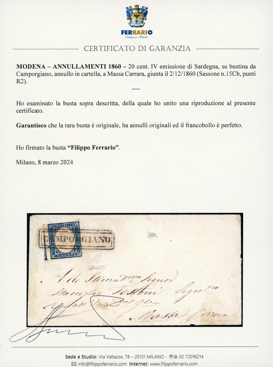 CAMPORGIANO, cartella punti R2 - 20 cent. IV emissione di Sardegna (15Cb), giusto in alto, su busta per Massa Carrara, bollo di arrivo del 2/12/1860. Rara. A.Diena, cert. Ferrario.