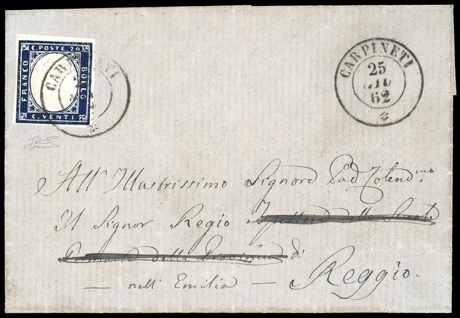 CARPINETI, sardo italiano punti 9 - 20 cent. IV emissione di Sardegna (15E), perfetto, su lettera del 25/6/1862 per Reggio. Ferrario.