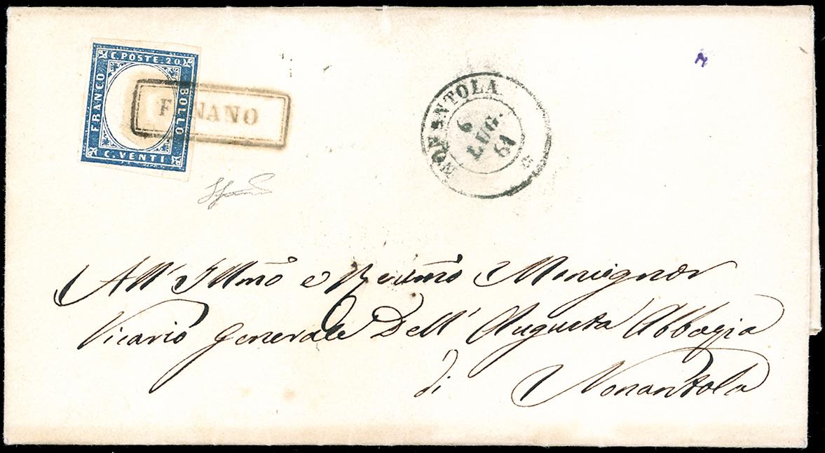 FANANO, cartella punti 13 - 20 cent. (Sardegna 15D), perfetto, su sovracoperta di lettera per Nonantola 6/7/1861. Splendida! Ferrario.