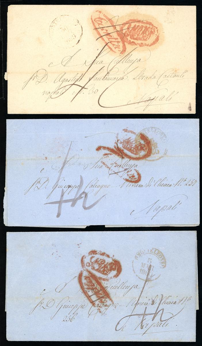 1859/60 - Tre lettere non affrancate, tutte con l'infrequente tassazione di 4 grana e mezzo e il bollo ovale "corretta" a cassare la precedente tassazione. Non comuni. Ex coll. Imperato.