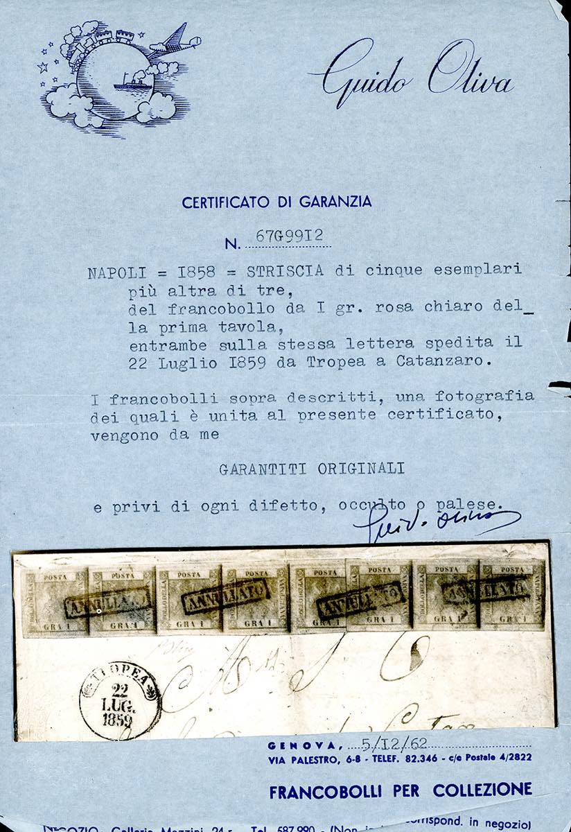 1859 - 1 grano rosa chiaro, I tavola (3), striscie orizzontali di cinque e di tre, perfette, ben marginate e di eccezionale freschezza, su frontespizio di lettera di 4 porti, lieve piega verticale che non interessa i francobolli, da Tropea 22/7/1859 a Catanzaro. Bellissima. A.Diena, Chiavarello, cert. G.Oliva. Ex coll. Imperato.