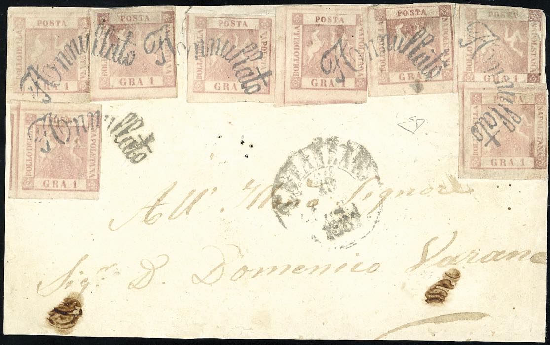 1858 - 1 grano rosa carminio, II tavola (4), otto esemplari, due riparati, su frontespizio di lettera, incompleto in basso, spedito da Catanzaro, annullo a svolazzo. Rara affrancatura d'effetto! Cert. Diena.