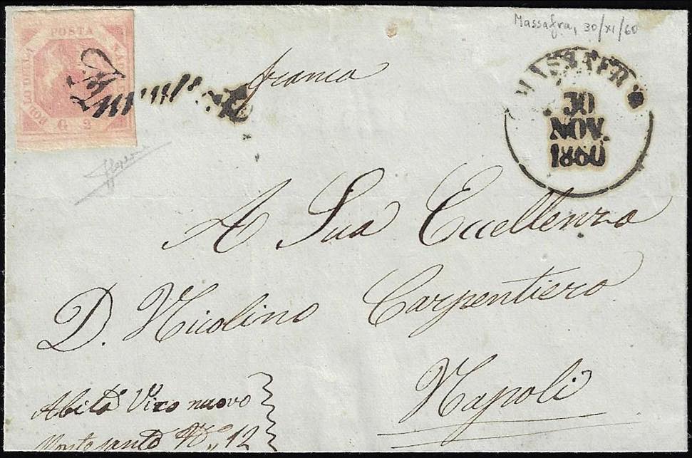 1860 - 2 grana rosa chiaro, I tavola (5), perfetto, su sovracoperta di lettera da Massafra 30/11/1860, annullo a svolazzo, a Napoli. Interessante lettera in periodo di Luogotenenza di Luigi Farini. Sorani.
