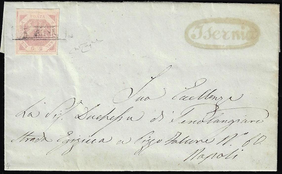 1858 - 2 grana lilla rosa, I tavola (5b), perfetto, su lettera da Isernia 1/3/1858 a Napoli. Bella! Cert. Raybaudi.