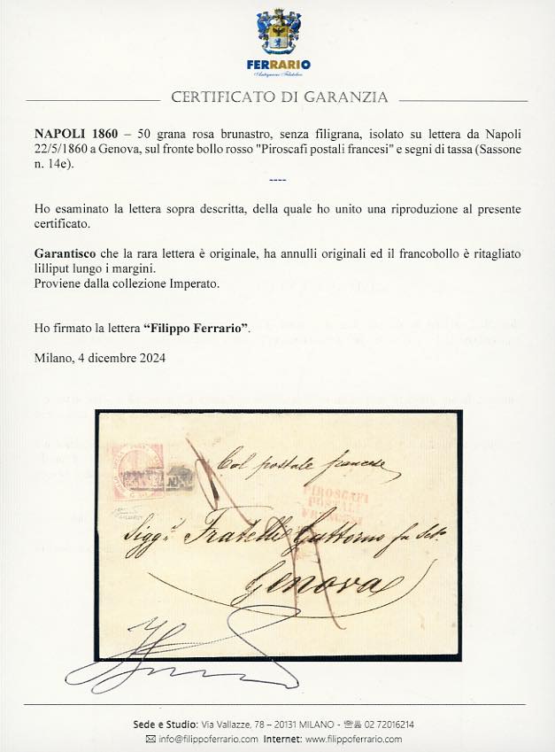 1860 - 50 grana rosa brunastro, senza filigrana (14e), ritagliato lilliput lungo i margini, isolato su lettera da Napoli 22/5/1860 a Genova, sul fronte bollo rosso "Piroscafi postali francesi" e segno di tassa. INSIEME UNICO! Cert. Ferrario. Ex coll. Imperato.