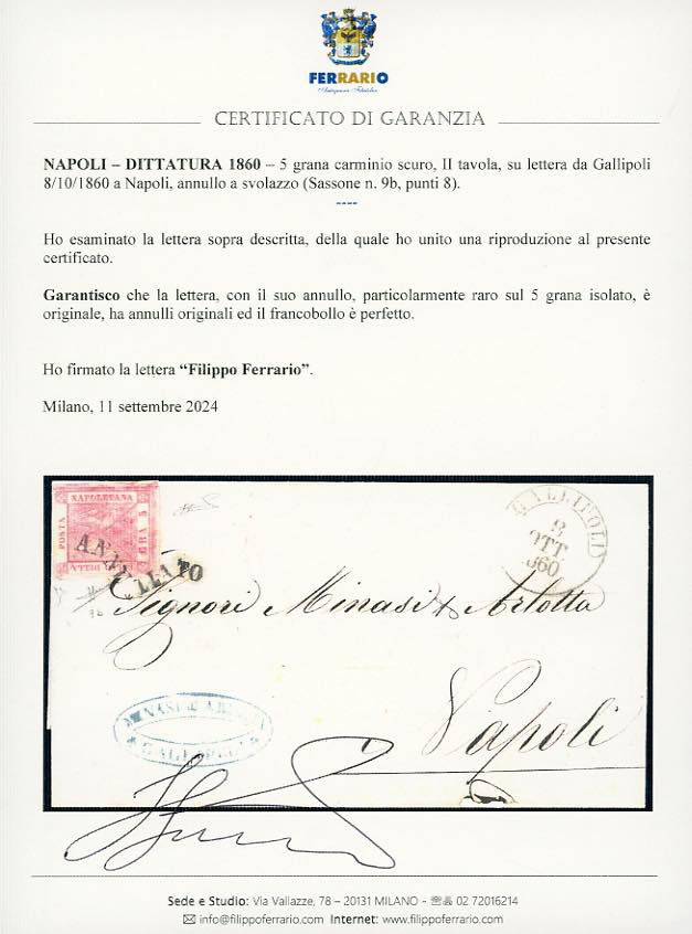 1860 - 5 grana carminio scuro, II tavola (9b), perfetto, su lettera da Gallipoli 8/10/1860 (svolazzo,punti 8), a Napoli. Raro l'annullo a svolazzo sul 5 grana isolato, specie in questo periodo. Per specialista. Sorani, Fiecchi, cert. Ferrario.