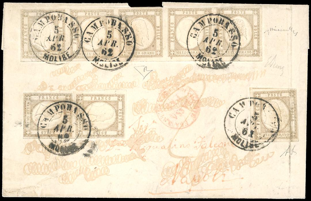 1862 - 1/2 grano bistro bruno (18), striscia di cinque e coppia, perfette, e singolo, piega verticale, su sovracoperta di lettera da Campobasso 5/4/1862 a Napoli, tassata 2 e bollo di tassa insufficiente. Affrancatura multipla di grande rarità! Enorme valore di catalogo.Emilio ed A.Diena, Chiavarello, cert. Diena.