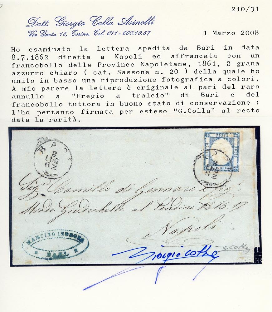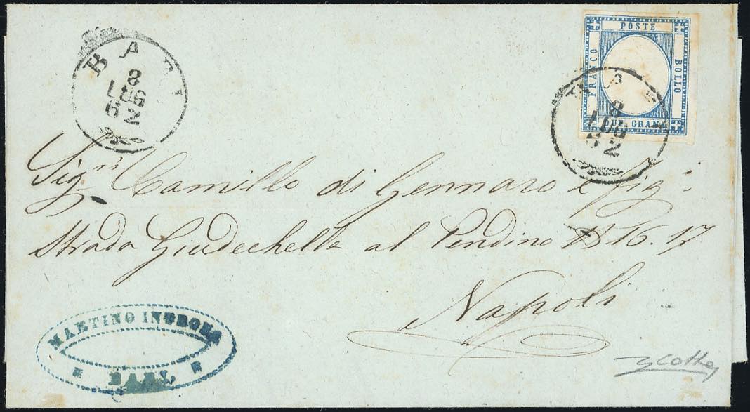 BARI, cerchio piccolo con fregio a tralcio punti R1 - 2 grana (20), perfetto, su sovracoperta di lettera del 8/7/1862 per Napoli. Molto rara. Cert. Colla.