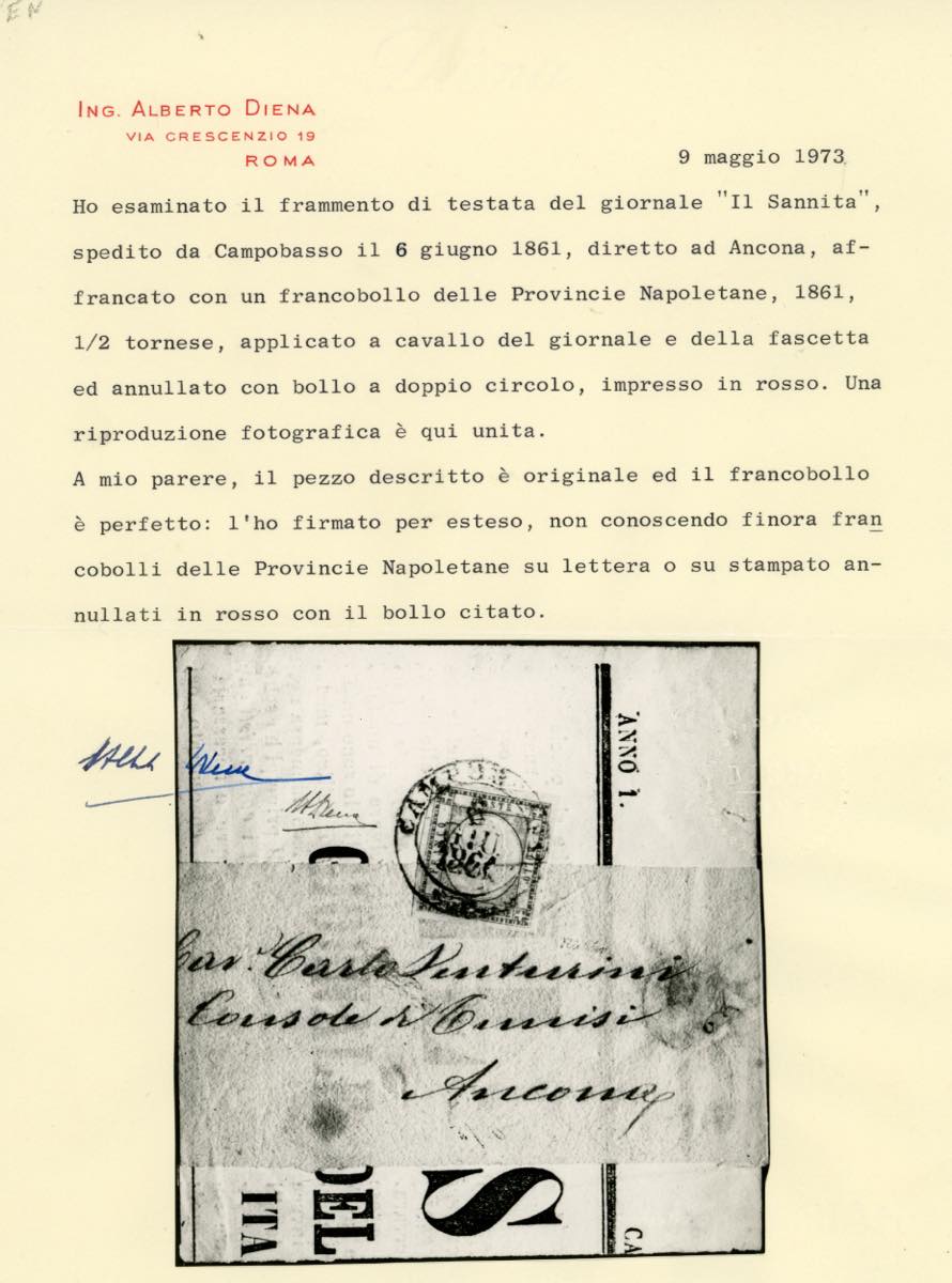 CAMPOBASSO, doppio cerchio grande rosso punti R2 - 1/2 tornese (17a), perfetto, isolato su fascetta con parte di giornale del 6/6/1861 per Ancona. Unico noto, splendida rarità del settore. Cert. A.Diena e Colla.