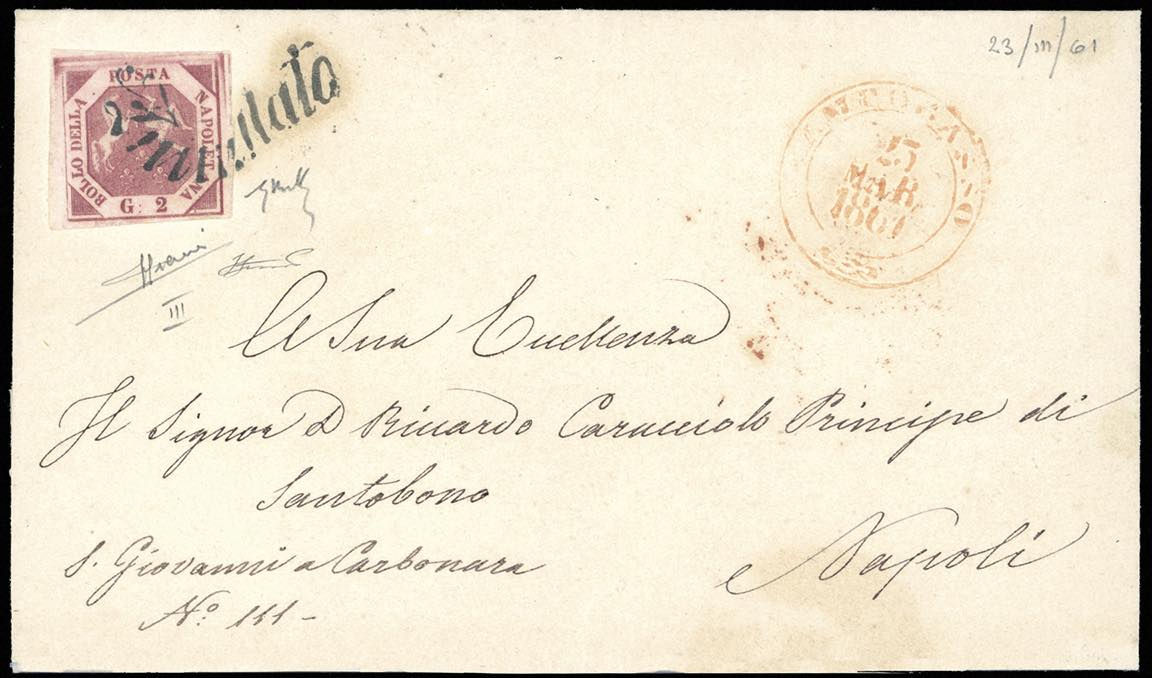 CAMPOBASSO, svolazzo + doppio cerchio grande in rosso punti 8 - 2 grana (7), perfetto, su lettera del 23/3/1861 per Napoli. Sorani, Chiavarello, Ferrario.
