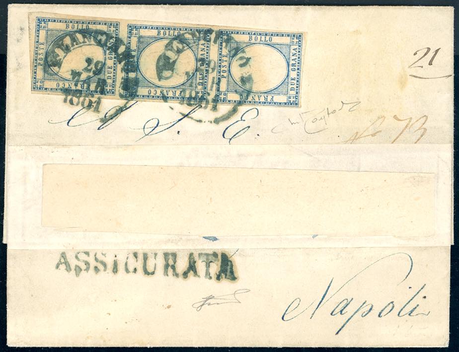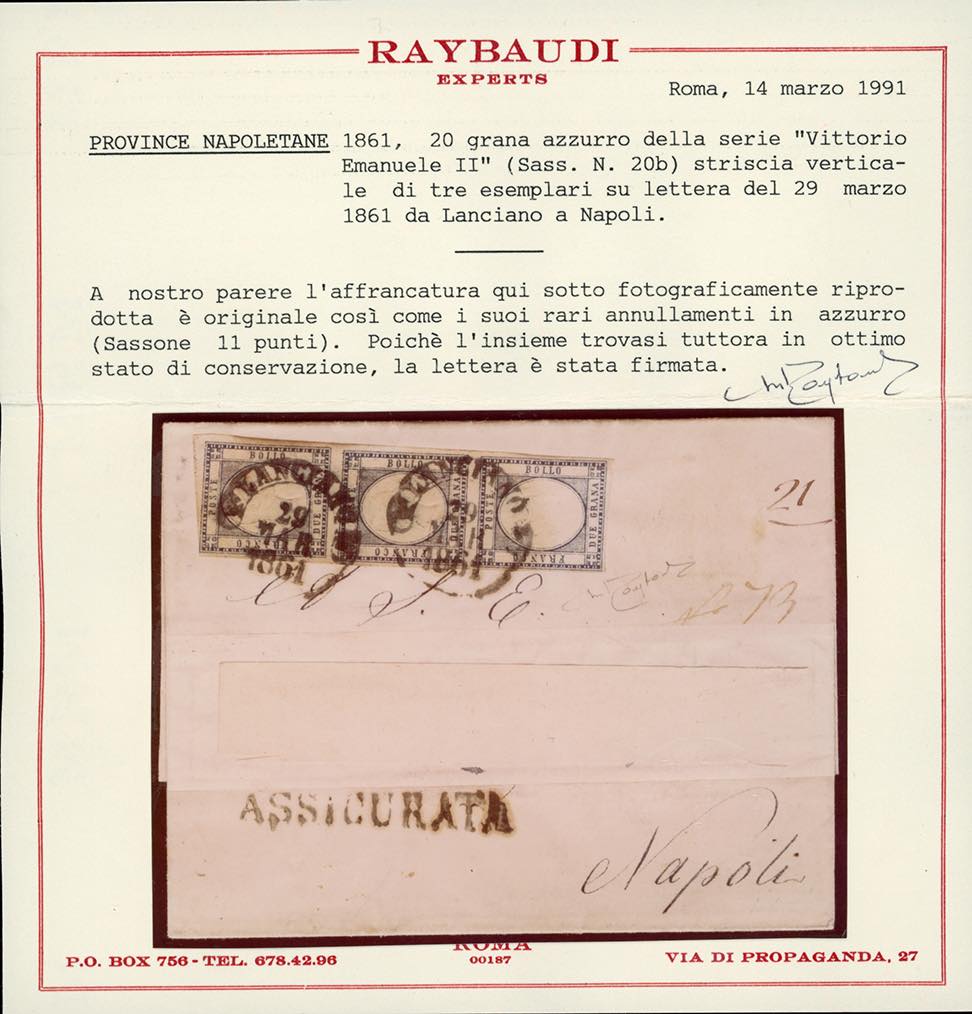 LANCIANO, cerchio azzurro punti 11 - 2 grana (20b), striscia verticale di tre, perfetta, su lettera assicurata, indirizzo asportato, del 29/3/1861 a Napoli. Pregevole annullo, impreziosito dal lineare "assicurata" dello stesso colore, ad oggi non catalogato. Ferrario, cert. Raybaudi.
