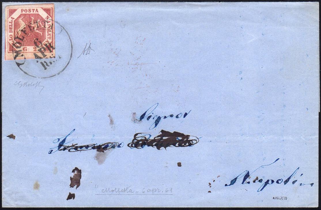 MOLFETTA, cerchio punti 10 - 2 grana (7d), perfetto, su sovracoperta di lettera del 6/4/1861 per Napoli. G.Bolaffi, A.Diena.