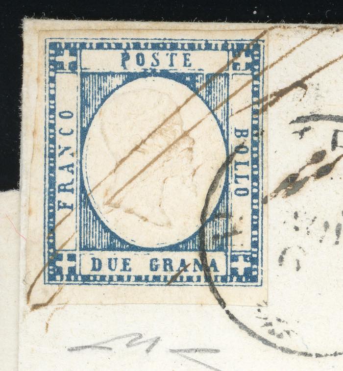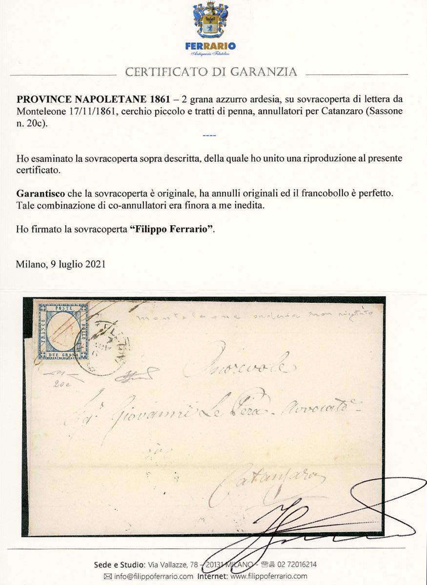 MONTELEONE, cerchio piccolo + penna, combinazione non catalogata - 2 grana azzurro ardesia (20c), perfetto, su sovracoperta di lettera del 17/11/1861 per Catanzaro. Combinazione di coannullatori inedita. Manzoni, cert. Ferrario.