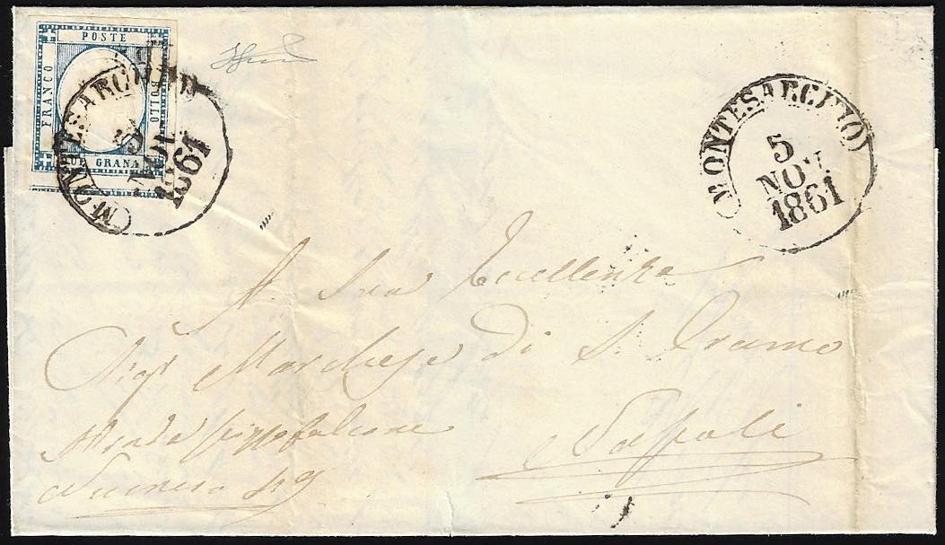 MONTESARCHIO, cerchio punti 10 - 2 grana (20), perfetto, su sovracoperta di lettera del 5/11/1861 per Napoli. Ferrario.