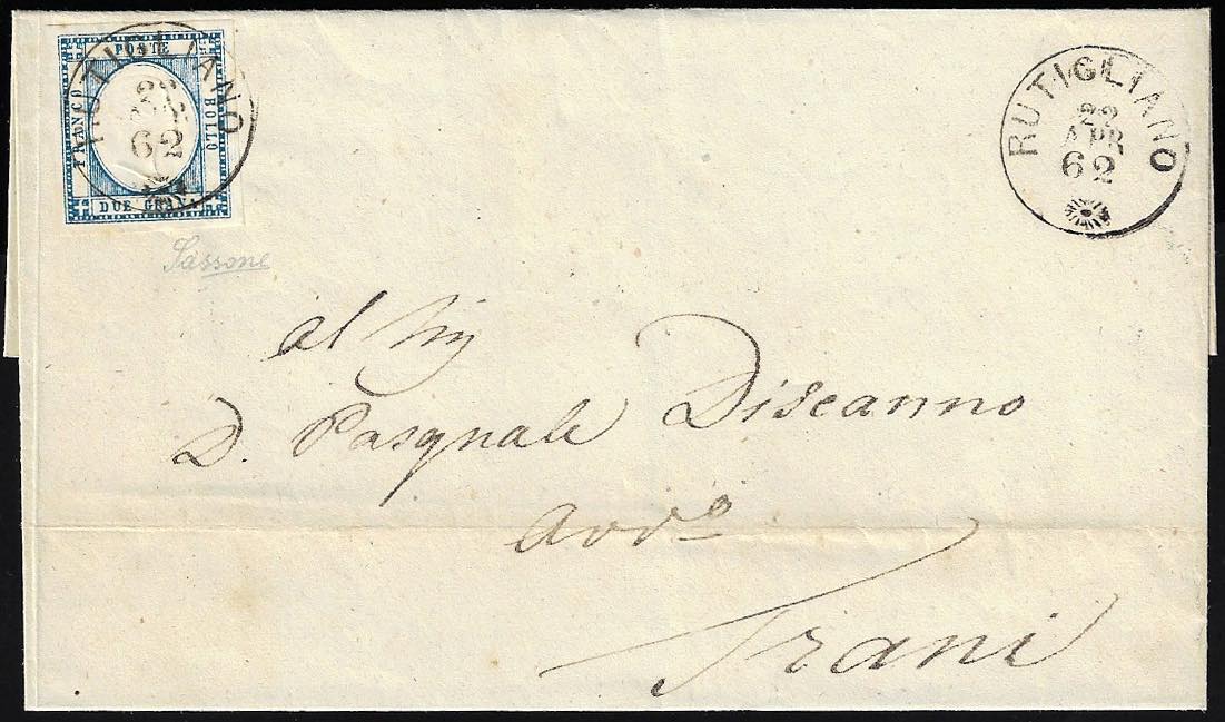 RUTIGLIANO, cerchio piccolo punti 8 - 2 grana (20), perfetto, su sovracoperta di lettera del 22/4/1862 per Trani. Sassone.