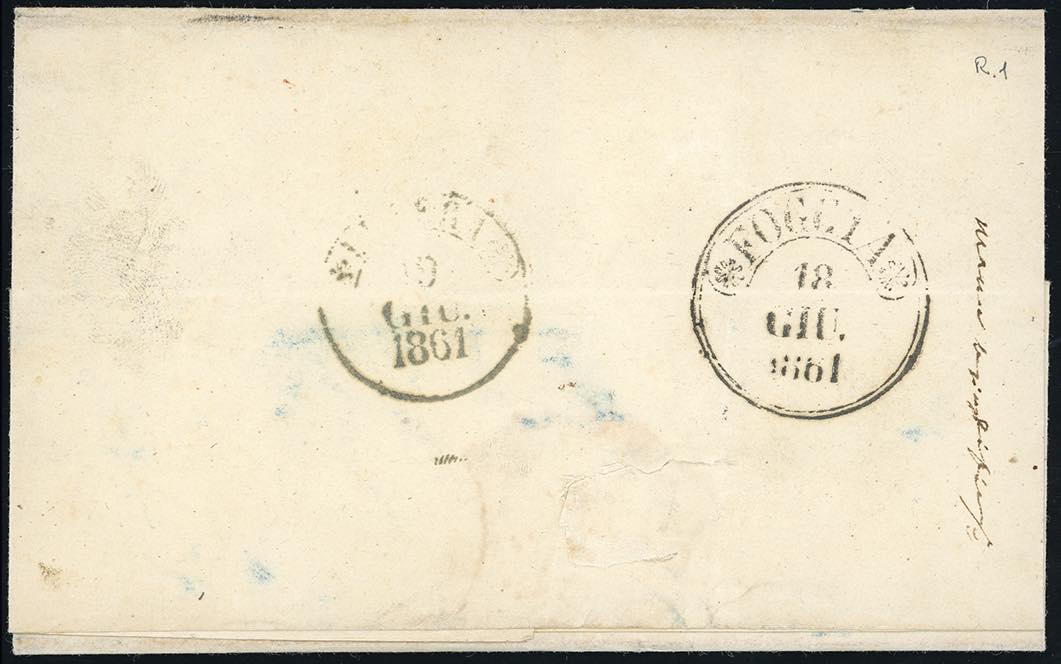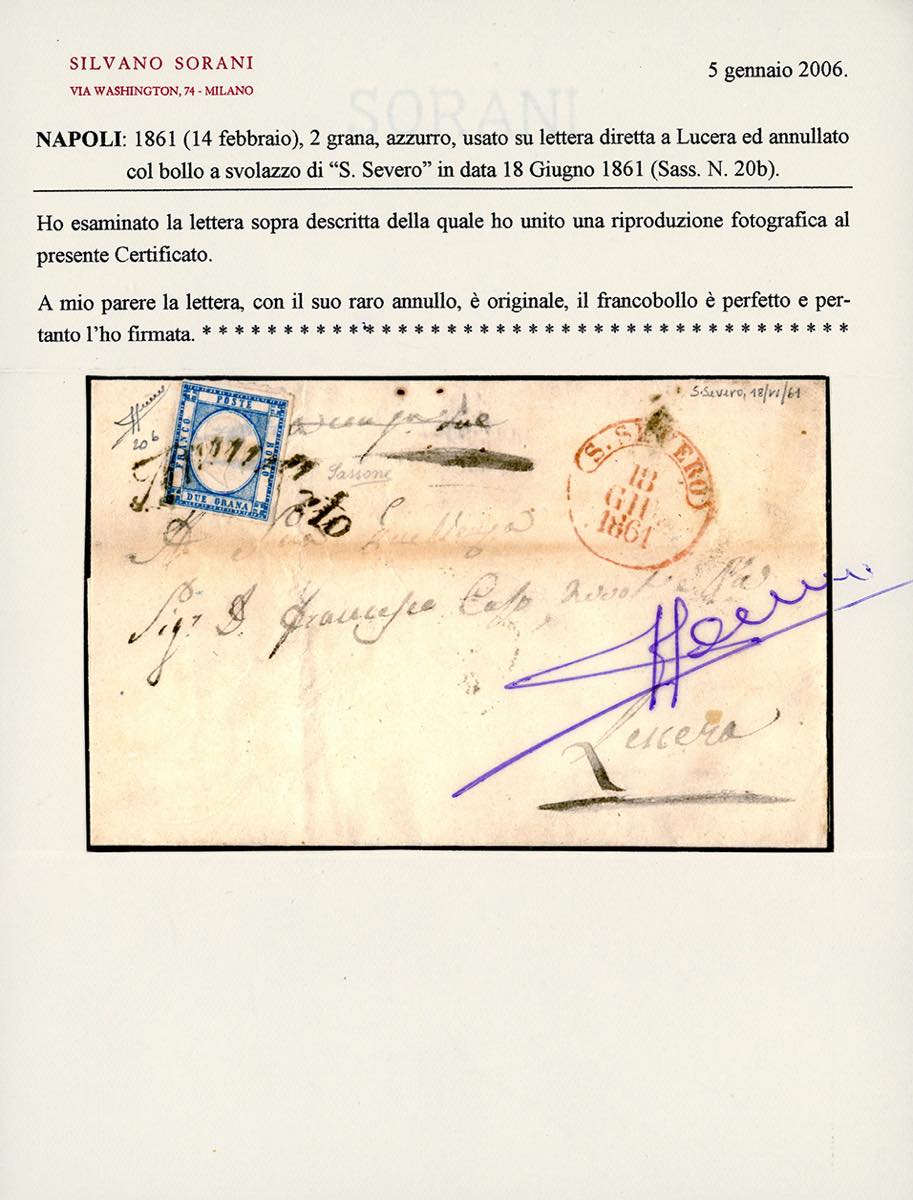 SAN SEVERO, svolazzo + cerchio rosso punti R1 - 2 grana (20b), perfetto, su sovracoperta di lettera del 18/6/1861 per Lucera. Raro! ... Leggi tutto