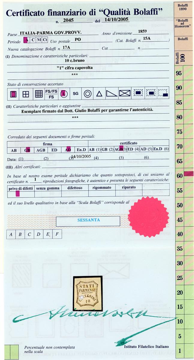 1859 - 10 cent. bruno, cifra "1" capovolta (14b), gomma originale, perfetto. Bello! G.Bolaffi, A.Diena, cert. Finanziario Bolaffi.