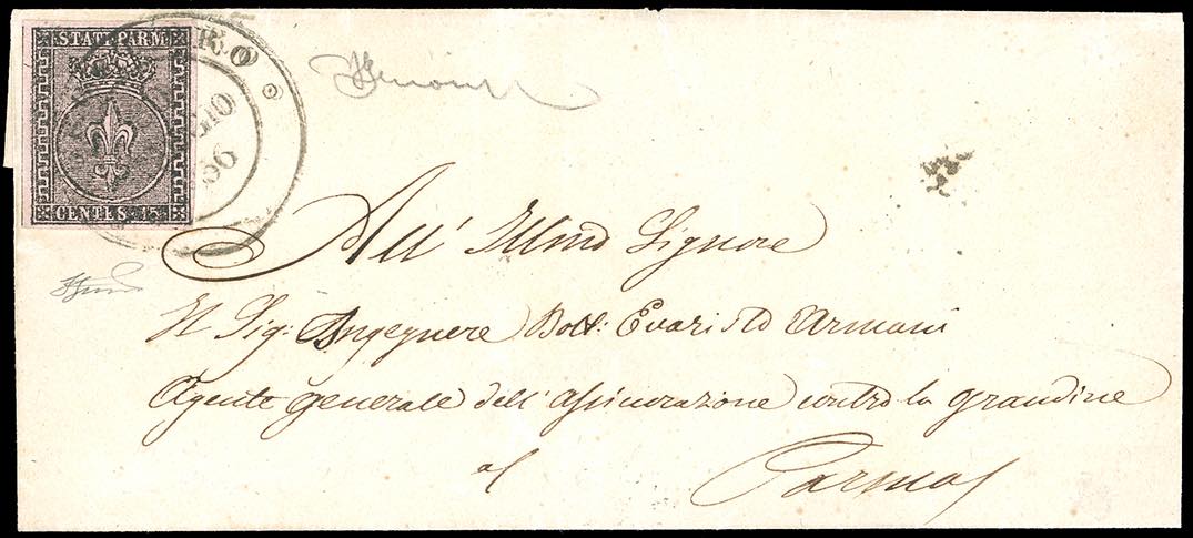 BORGOTARO, doppio cerchio punti 6 - 15 cent. (3), perfetto, su fresca lettera del 30/5/1856 per Parma. Molto bella. Grioni, Ferrario.