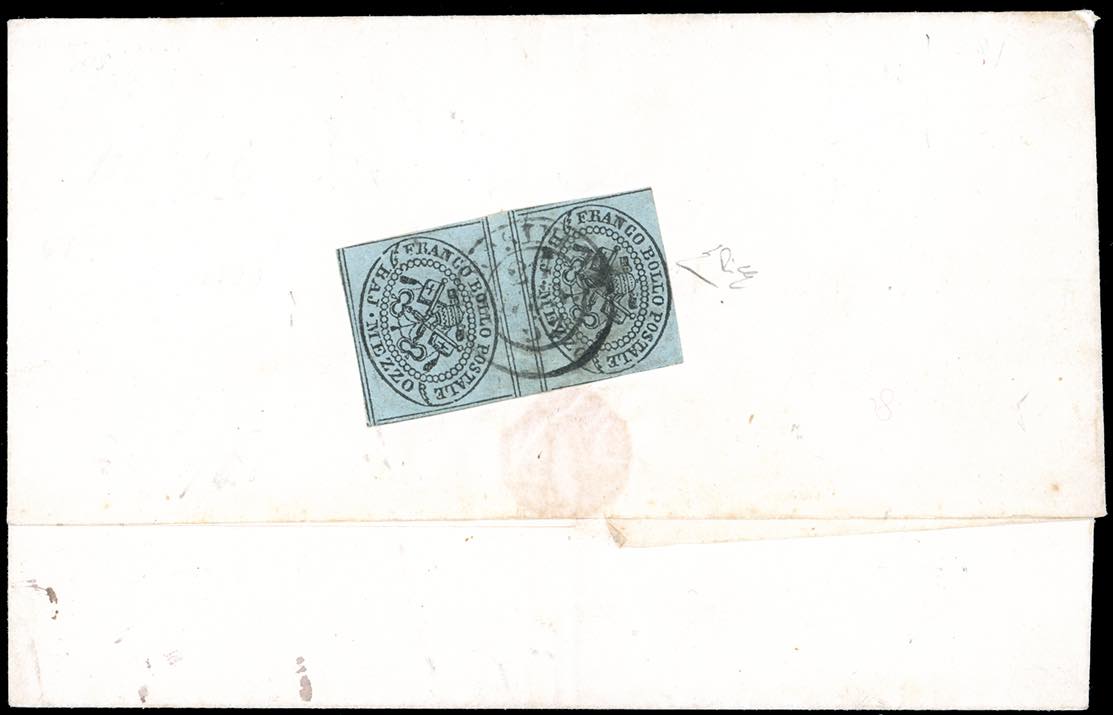 1852 - 1/2 baj grigio azzurro (1a), coppia verticale con interspazio di gruppo al centro, perfetta, al verso di fresca lettera in porto assegnato da Frosinone 21/1/1852 a Paliano. Ottima qualità. Cert. E.Diena. Ex coll. Imperato.