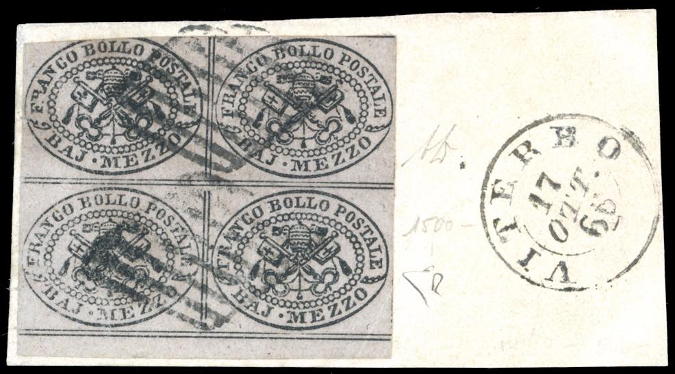 1864 - 1/2 baj violetto grigiastro (1A), blocco di quattro, bordo di foglio, il primo esemplare con il margine superiore intaccato, gli altri perfetti, usato su frammento a Viterbo 17/10/1866. Cert. A. ed E.Diena. Ex coll. Imperato.