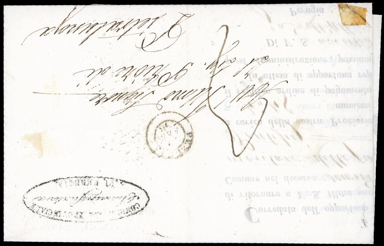 1858 - 1 baj verde grigiastro, striscia orizzontale di tre contenente una coppia con interspazio di gruppo (2), perfetta, al verso di lettera in porto assegnato da Perugia 19/2/1858 a Pietralunga. Molto fresca e non comune. G.Oliva e Ferrario. Ex coll. Imperato.