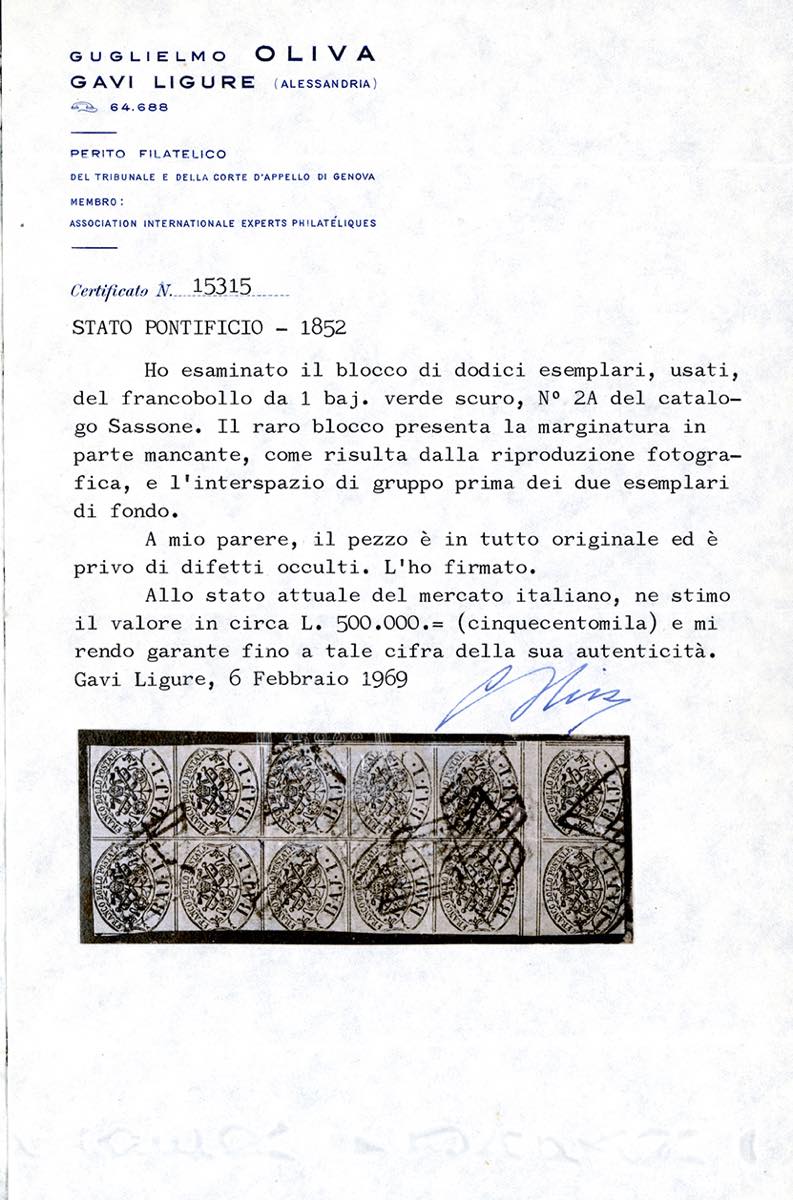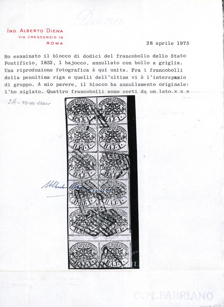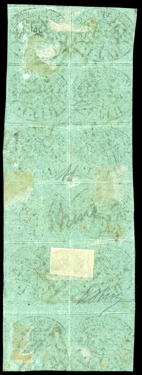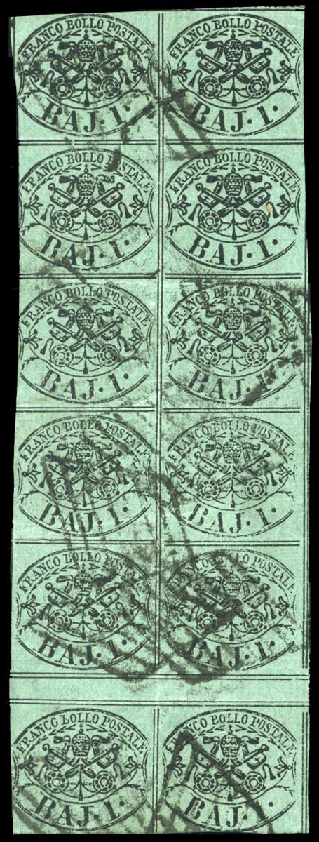 1857 - 1 baj verde scuro, I composizione (2A), blocco verticale di dodici esemplari, interspazio di gruppo orizzontale tra la penultima e l'ultima riga, margine sinistro da completo a leggermente intaccato, usato, perfetto. Estremamente raro ed insieme probabilmente unico. Em.Diena, cert. G.Oliva e A.Diena. Ex coll. Imperato.