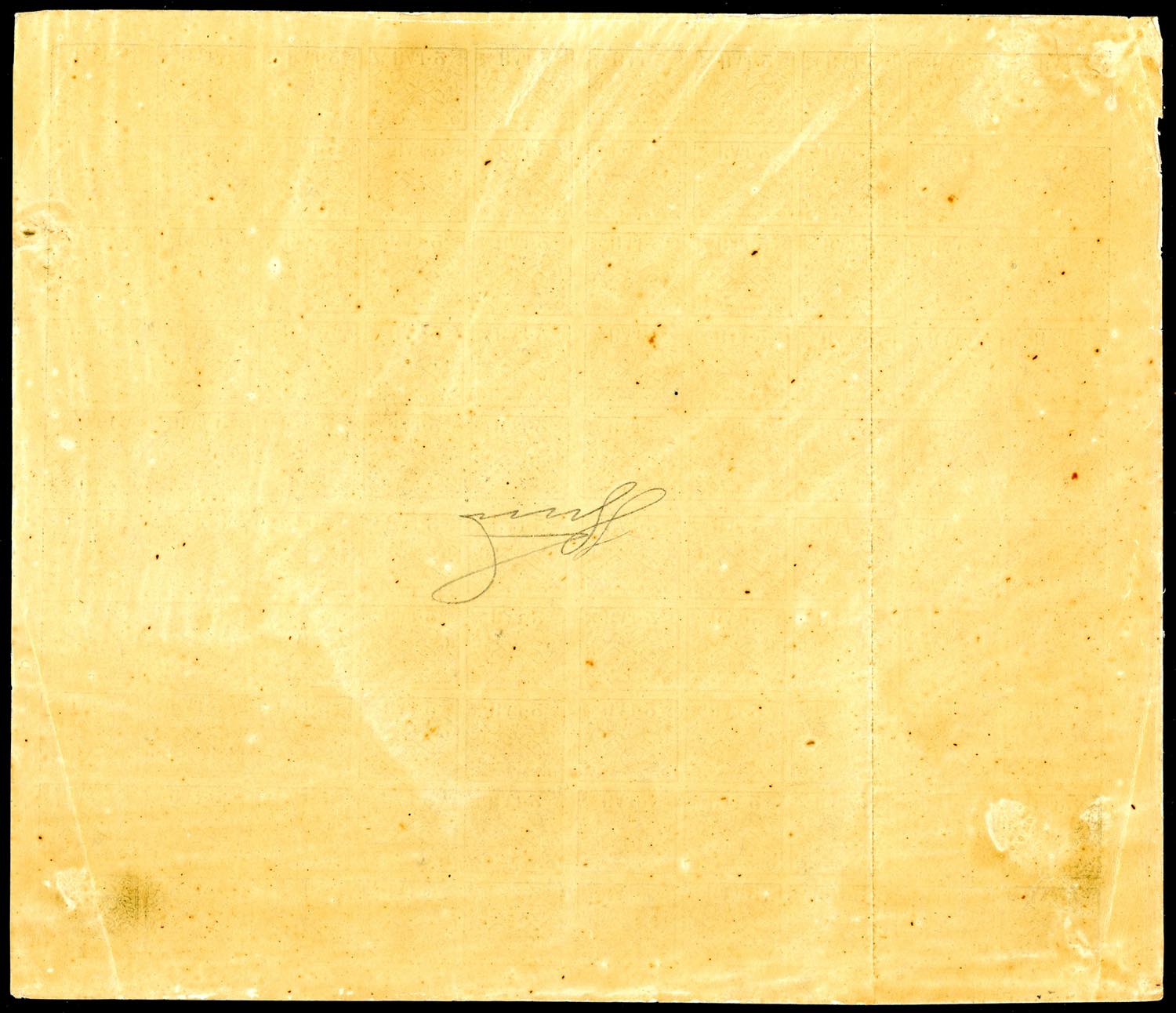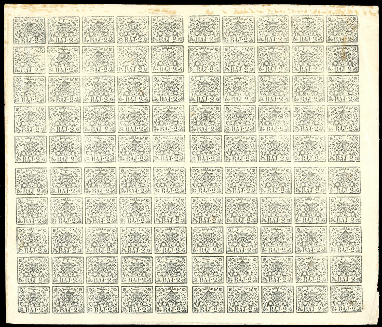 1867 - 2 baj bianco (3A), foglio completo di 100 esemplari, con gli interspazi di gruppo al centro, gomma originale integra, due lievi pieghe, ottimo aspetto. Ferrario. Ex coll. Imperato.