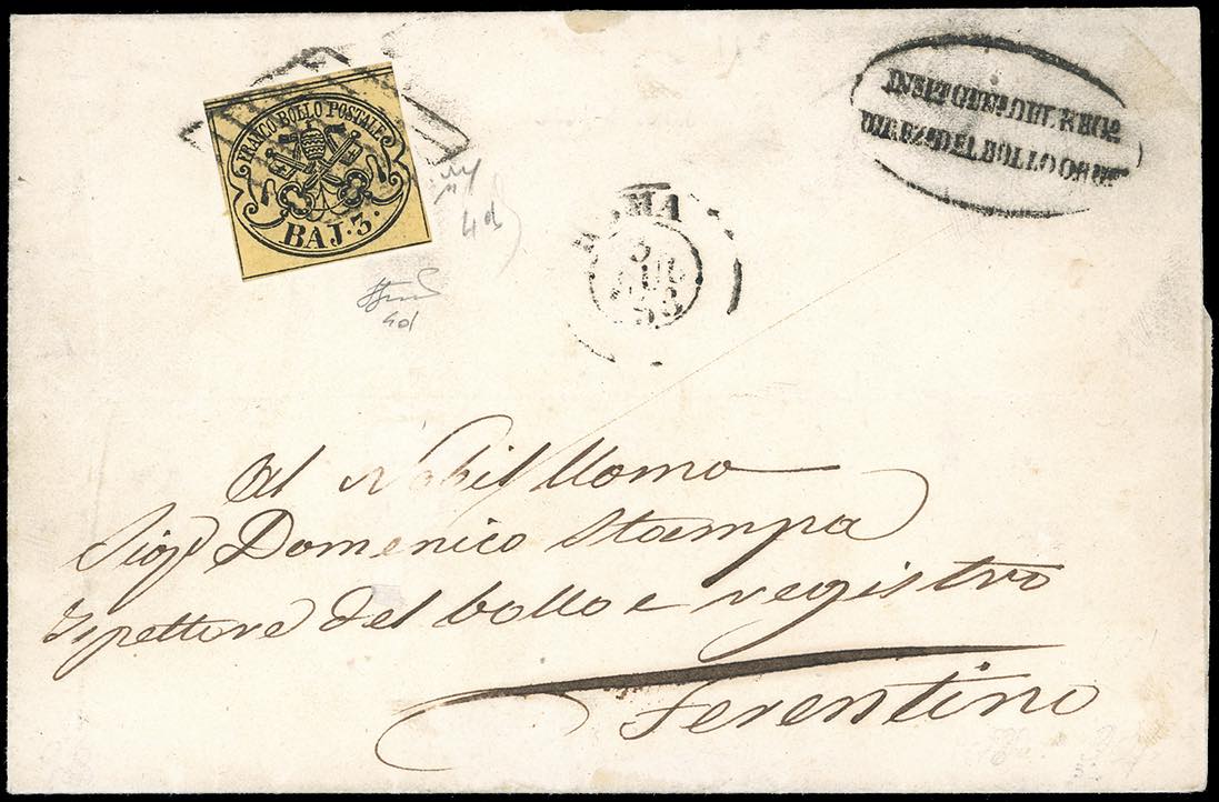 1858 - 3 baj giallo paglia (4d), perfetto, su lettera da Roma 3/7/1858 a Ferentino. Pregevole tinta, di ottima qualità. Chiavarello, cert. Ferrario. Ex coll. Imperato.