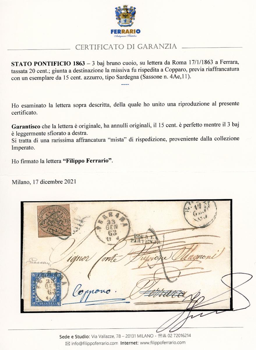 1863 - 3 baj bruno cuoio (4Ac), su lettera da Roma 17/1/1863 a Ferrara, tassata 20 cent. Giunta a destino, la lettera venne rispedita a Copparo previa riaffrancatura con 15 cent. azzurro tipo Sardegna (Regno 11). Rarissima affrancatura "mista" di rispedizione, di grande freschezza. E.Diena, Vaccari, ex coll. Imperato.