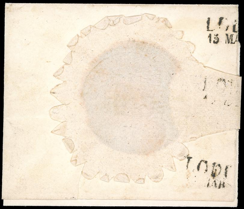 1854 - 8 baj bianco (9), perfetto, su fresca lettera da Roma 11/3/1854 a Lodi, al verso splendido sigillo cardinalizio a secco a chiusura ... Leggi tutto