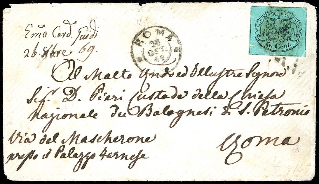 1869 - 5 cent. azzurro verdastro (16), ben marginato, lievi screpolature della carta, consuete per questa emissione, isolato su busta da Roma 26/10/1869 per città. Chiavarello. Ex coll. Imperato.
