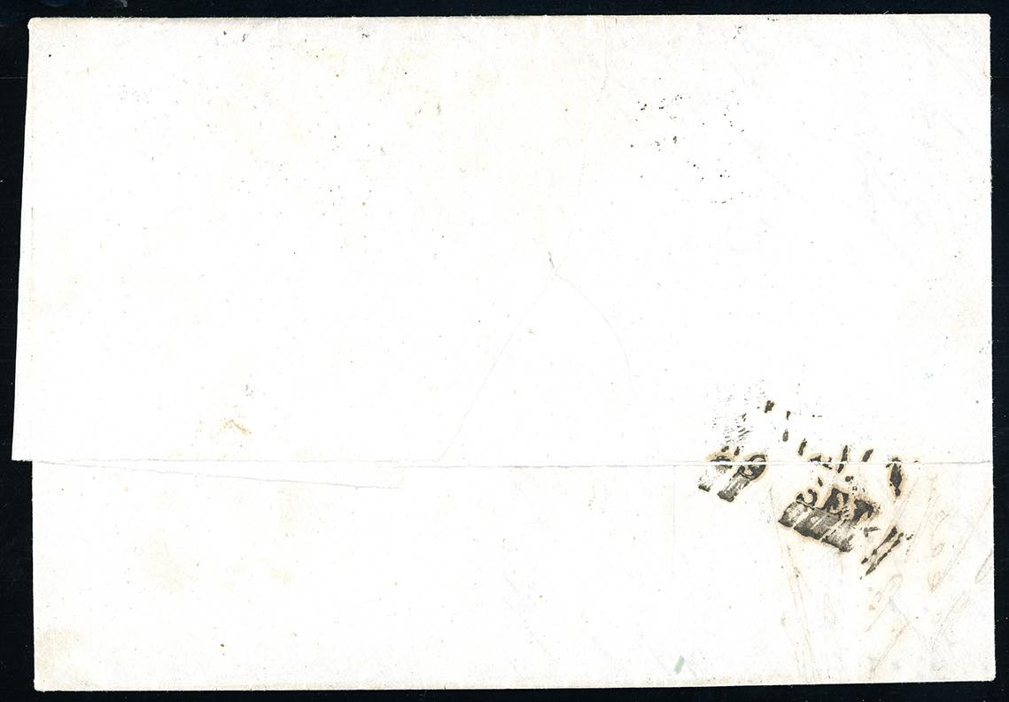 CENTO, SD azzurro + Croce di Sant'Andrea di Ferrara punti 12 - 2 baj, leggermente corto a destra, 6 baj, perfetto (3,7), su lettera del 27/9/1855 a Palma. Combinazione di annulli inedita e di prossima catalogazione. Cert. Avanzo.