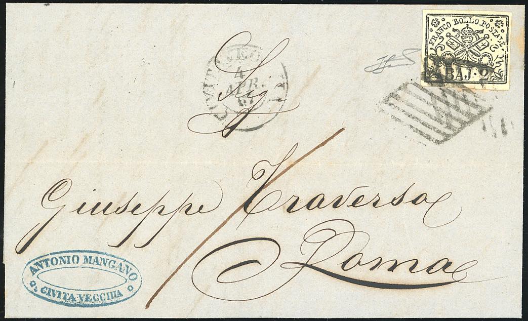 CIVITAVECCHIA - 2 baj bianco (3A), perfetto, annullato con due griglie incrociate su lettera del 4/4/1867 per Roma. Curioso e non frequente annullamento multiplo. Ferrario.