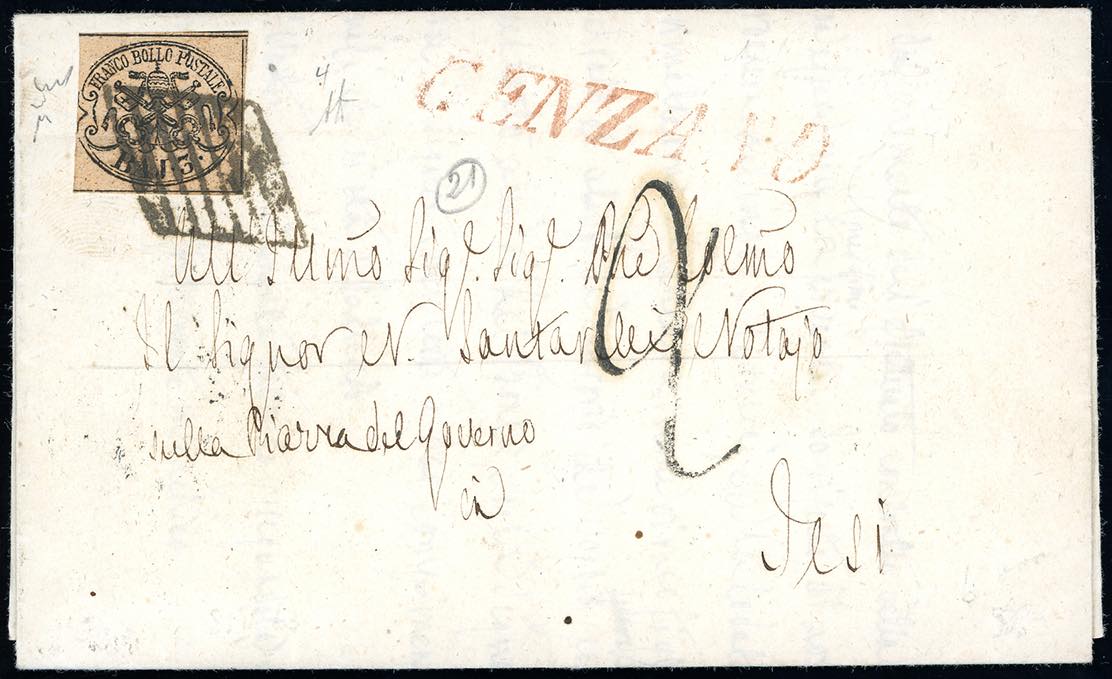 GENZANO, SI rosso punti 11 - 3 baj (4), lieve piega orizzontale, su lettera del 6/5/1863 per Jesi, tassata. Molto fresca, ottimo aspetto. A.Diena, Chiavarello. Ex coll. Imperato.