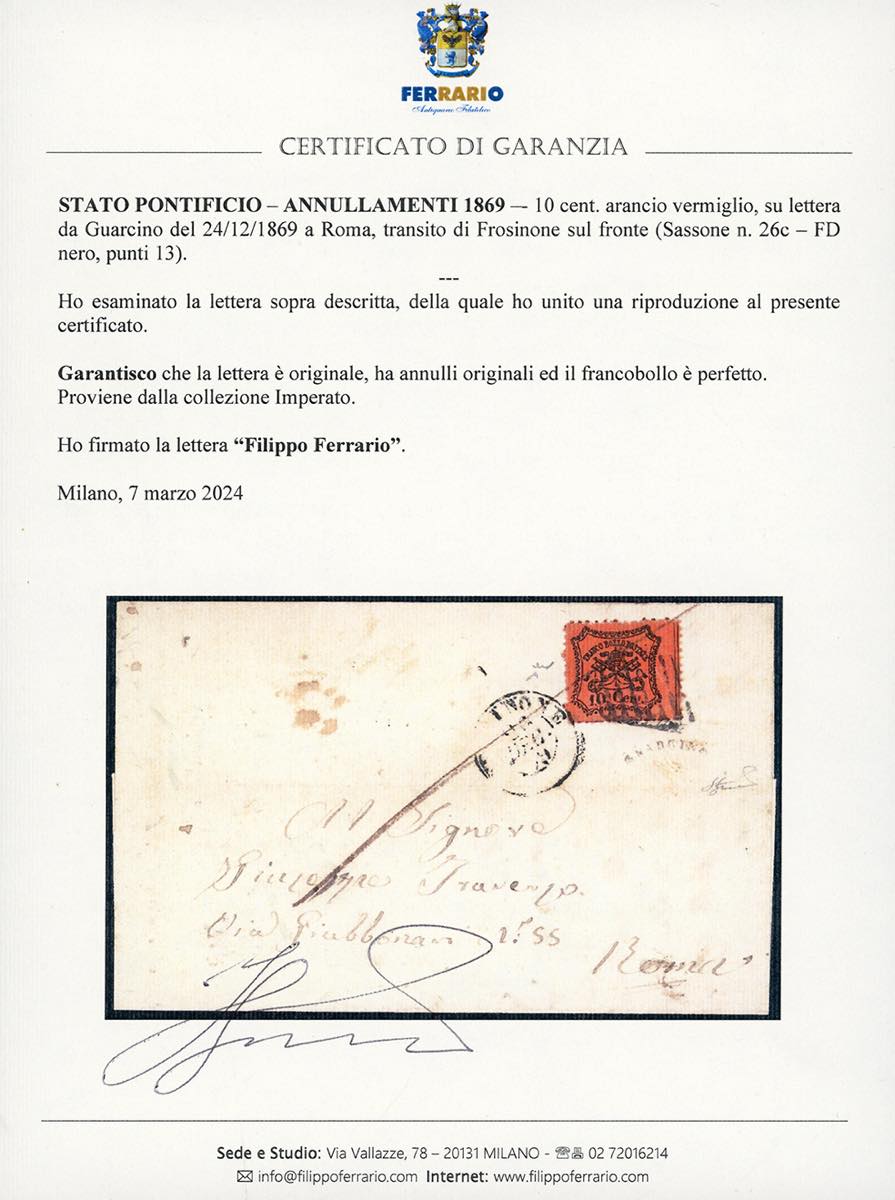 GUARCINO, FD nero punti 13 - 10 cent. (26c), ottimo stato, su lettera del 24/12/1869 per Roma, transito di Frosinone sul fronte. Chiavarello, cert. Ferrario. Ex coll. Imperato.