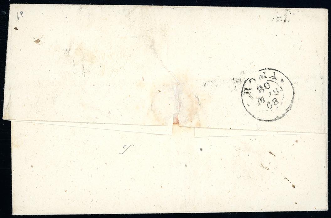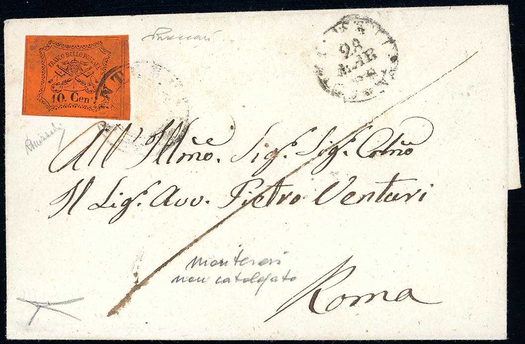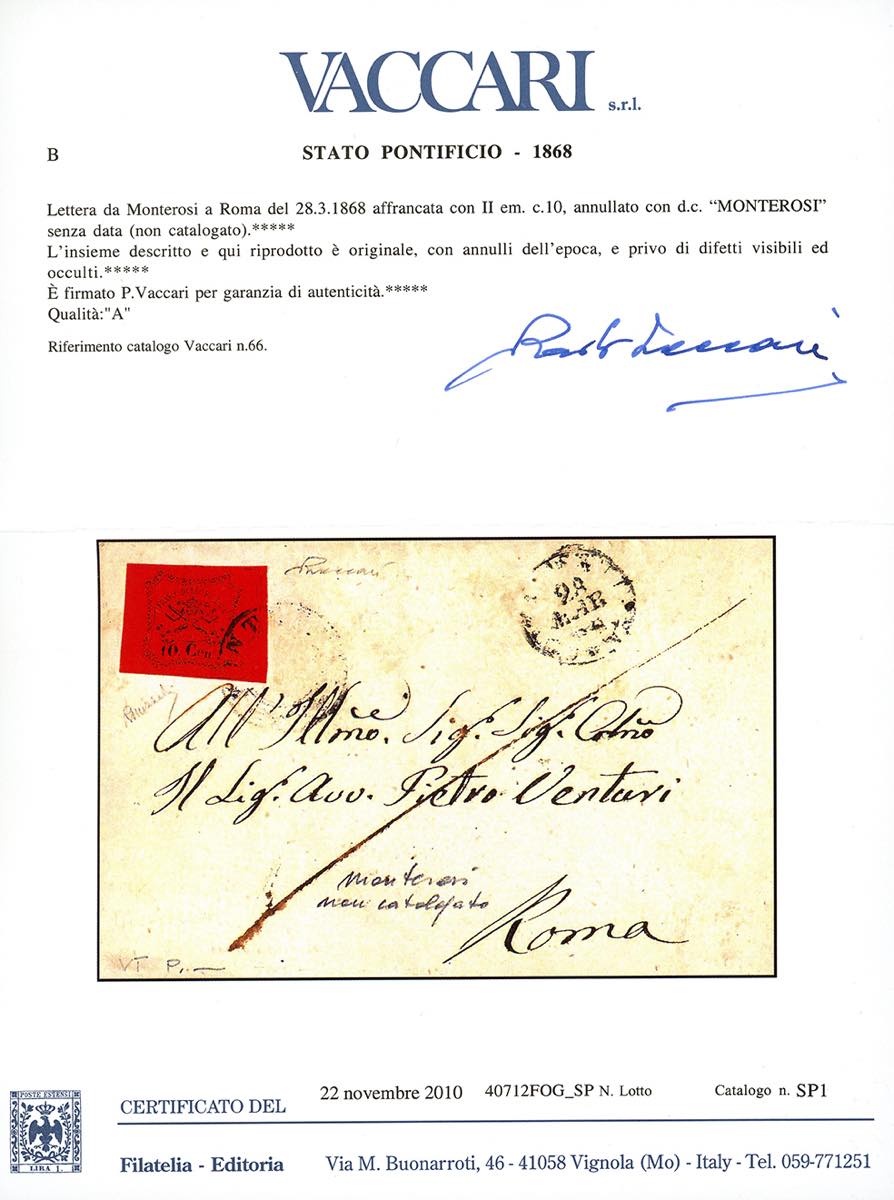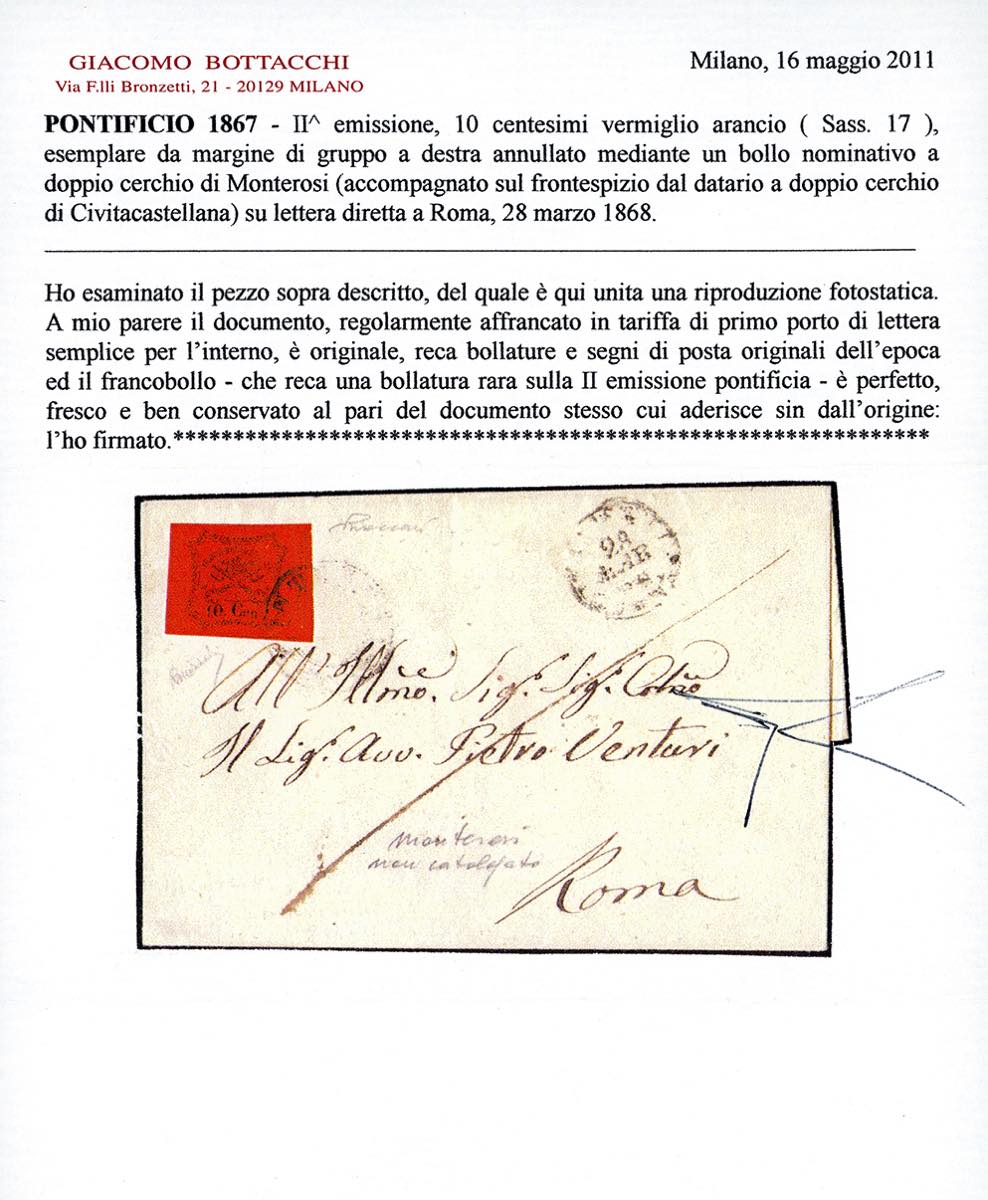 MONTEROSI, 2 C s.d. punti 13 - 10 cent. (17), perfetto su lettera del 28/3/1868, transito di Civita Castellana sul fronte, per Roma. Rara. Mezzadri, cert. Bottacchi e Vaccari.