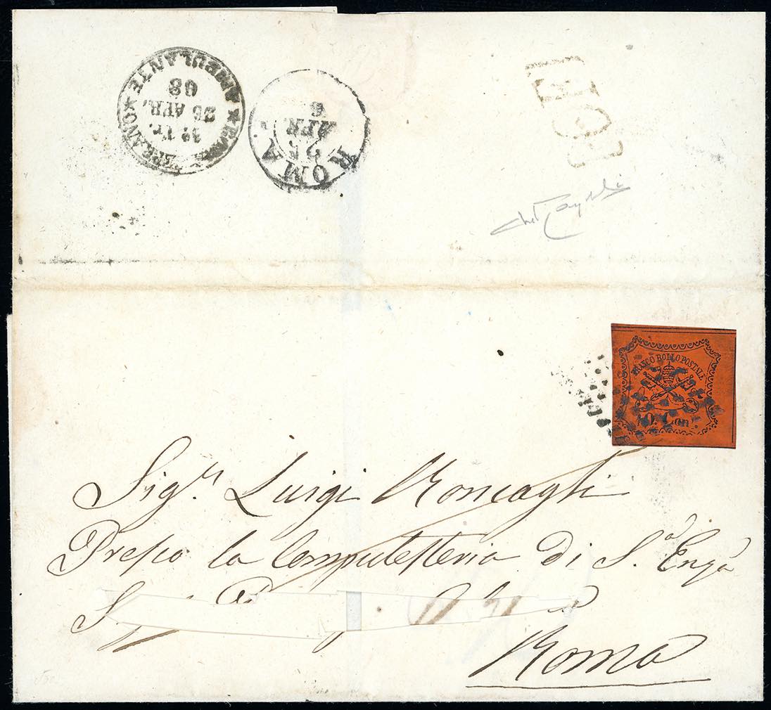 POFI, punti R1 - 10 cent. (17), perfetto, su fresca lettera per Roma 25/4/1868. Il francobollo venne annullato con il muto a losanga di trattini dell'ambulante Roma-Ceprano, il cui datario è stato apposto al verso. Raybaudi, cert. Bottacchi.