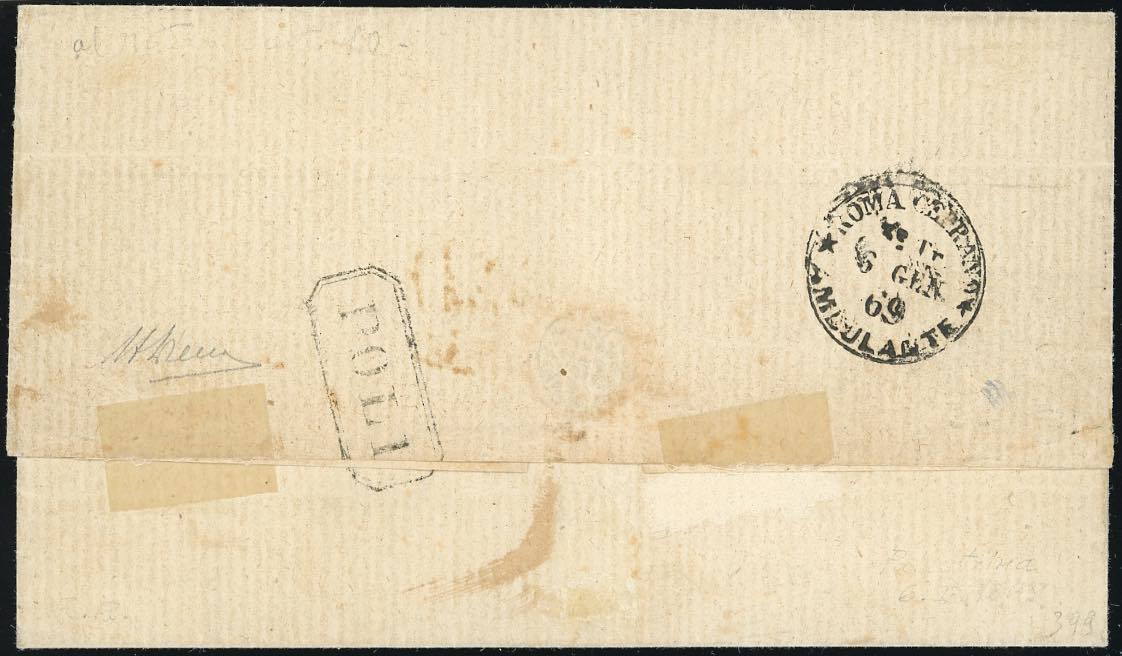 POLI, punti 13 - 10 cent. (26a), perfetto su sovracoperta di lettera del 6/1/1869 per Tivoli. Rara. Cert. Diena.