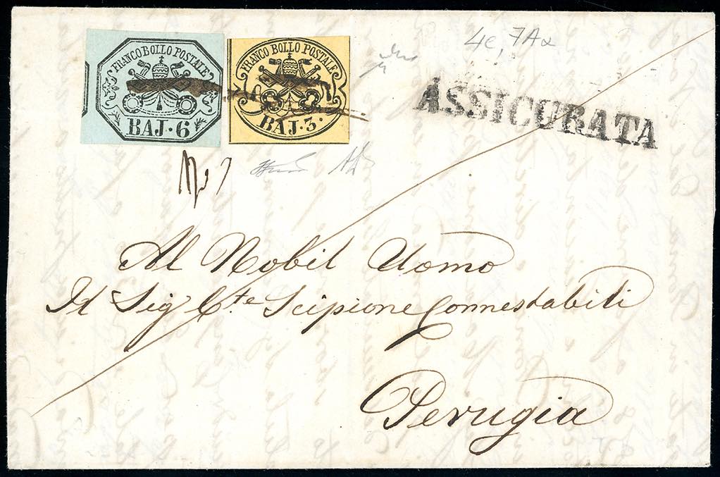 ROMA, a penna + assicurata III tipo, punti 10 - 3 baj giallo paglia, 6 baj grigio azzurrastro (4d,7b), su fresca lettera per Perugia 25/8/1858. Ottimo aspetto. A.Diena, Chiavarello, Ferrario. Ex coll. Imperato.