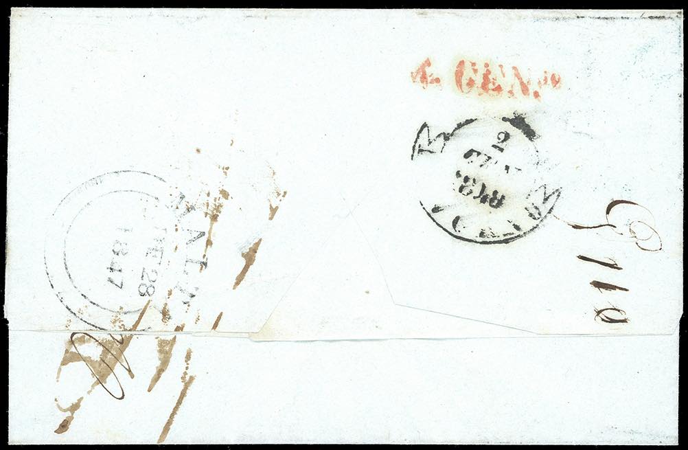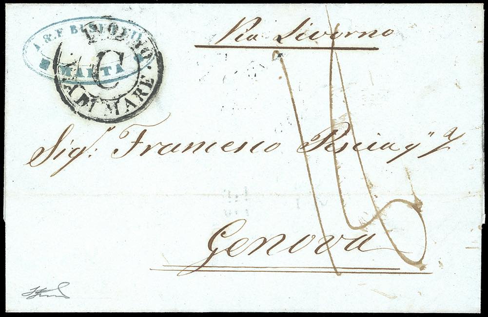 INCOMING MAIL MALTA 1847 - Lettera prefilatelica da Malta 28/12/1847 a Genova, via di Livorno, tassata in arrivo 18 soldi, pari a 90 cent., e inoltrata tramite i vapori francesi. Fino al 30/6/1848 i postali francesi non facevano scalo a Genova e le lettere trasportate venivano sbarcate a Livorno e inoltrate via terra nel Regno di Sardegna. Ferrario. Ex coll. Hess.