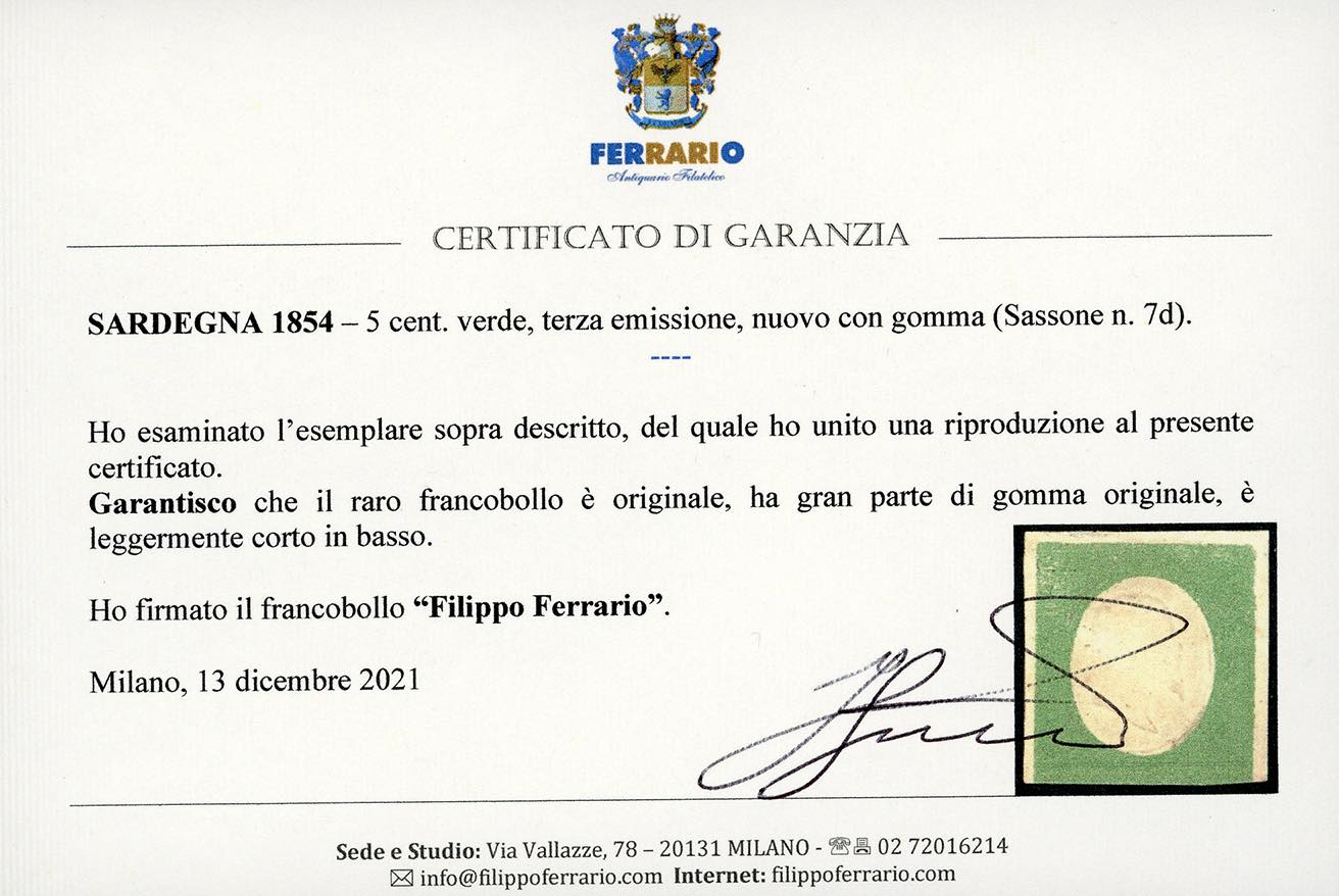 1854 - 5 cent. verde (7d), tre ottimi margini, leggermente intaccato in basso, nuovo, gran parte di gomma originale. Molto raro. Chiavarello. Ex coll. Imperato (cat. Sassone € 32.000/80.000). Cert. Ferrario e Bottacchi.