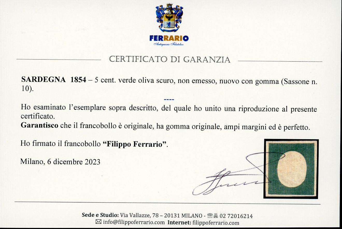1854 - 5 cent. verde oliva scuro non emesso, (10), gomma originale, perfetto. Fresco, ampi margini. Alberto ed Enzo Diena, cert. Ferrario.