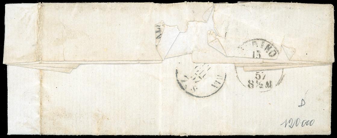 1857 - 5 cent. verde scuro (13Ac), coppia ben marginata, un esemplare piegato apposto "a cavallo", l'altro perfetto, su lettera diretta a ... Leggi tutto